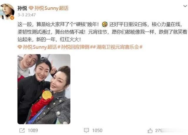 当晚,孙悦在微博发文以幽默的方式化解:“这一跤,算是给大家拜了个‘硬核’晚年!”她将台上的应变归功于平日锻炼积累的核心力量与柔韧性,更把意外升华为励志寄语:“人生就像舞台,跌倒了就笑着站起来,新的一年红红火火。”这番从容的回应,与现场观众赞叹的“状态真好,又年轻又漂亮”相互呼应,展现出她数十年如一日的专业素养。